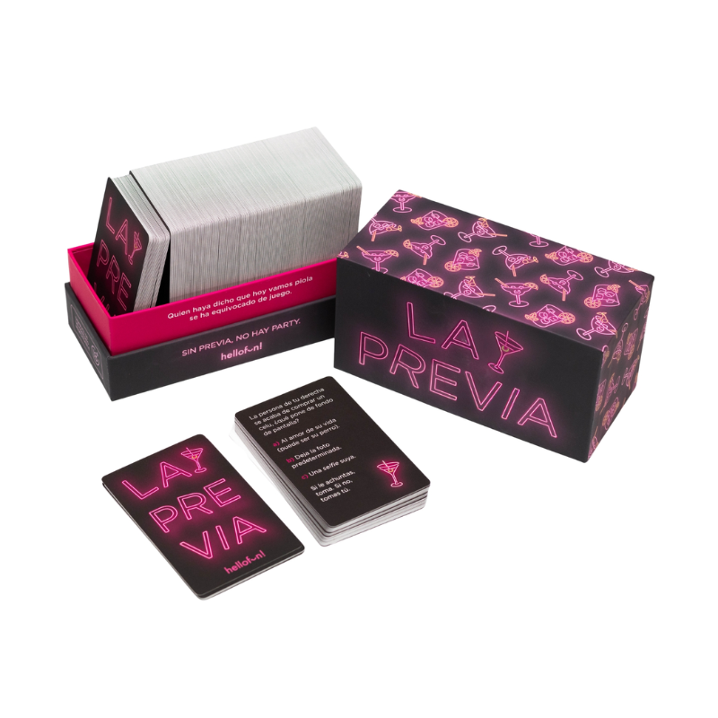 La Previa es el juego de carrete definitivo: 275 tarjetas con retos, preguntas y pruebas que transforman unas copas en una noche épica. Ideal para fiestas, juntas con amigos y cualquier previa. Ríe, señala, revela verdades (o miente muy bien)… y si fallas, ¡bebe!