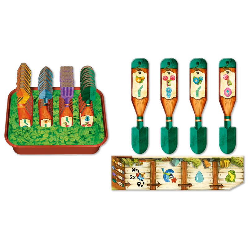 tablero de acciones, 4 tableros de jardín, 4 tableros de pérgola, 4 tableros de cascada, 4 tableros de puntuación, tablero de hojas, tablero de Estanque, 63 Herramientas, 107 fichas de Planta, 30 Mariposas, 30 Mariquitas, 40 Abejas, 21 Libélulas, 30 Hojas, 16 Farolillos, 16 Tarros de miel, 4 Casetas de pájaro, 4 macetas de participante, portaherramientas, bandeja de fichas, 8 Gotas de agua, 4 Ranas, bloc de puntuación, reglamento